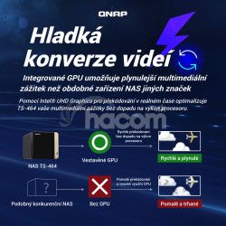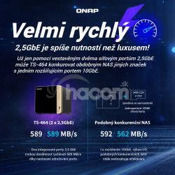 Zariadenie TS-464 je vybavené štvorjadrovým procesorom Intel Celeron N5095 (s navýšením až na 2,9 GHz), dvoma portami RJ45 2,5 GbE a funkciou Zlučovanie portov pre kombinovanú šírku pásma až 5 Gb/s. Vďaka slotom M.2 PCIe Gen3 a PCIe Gen 3 poskytuje zariadenie TS-464 flexibilitu pri rozširovaní funkcií NAS a umožňuje inštalovať kartu QM2 pre M.2 SSD cache alebo Edge TPU na rozpoznávanie obrázkov na báze umelej inteligencie a rôzne sieťové karty 10GbE/5GbE. Zariadenie TS-464 má 8GB RAM pre beh nenáročných virtuálnych počítačov a kontajnerov, podporuje multicloudové zálohovanie, brány cloudového úložiska, výstup 4K HDMI a prekódovanie v reálnom čase, spolu s rozšíriteľnou kapacitou úložiska a aplikáciami bohatými na funkcie, ktoré fungujú ako nákladovo efektívne zariadenie 2,5GbE NAS.