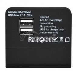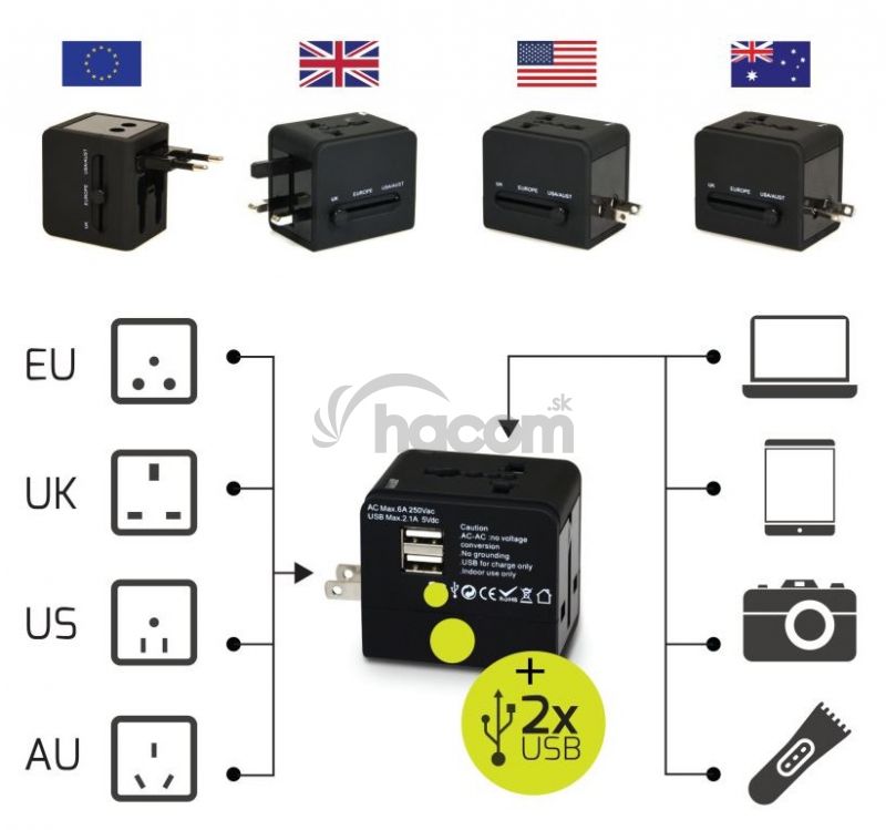 - Sandberg cestovný adaptér 4v1 + 2x USB nabíjanie
