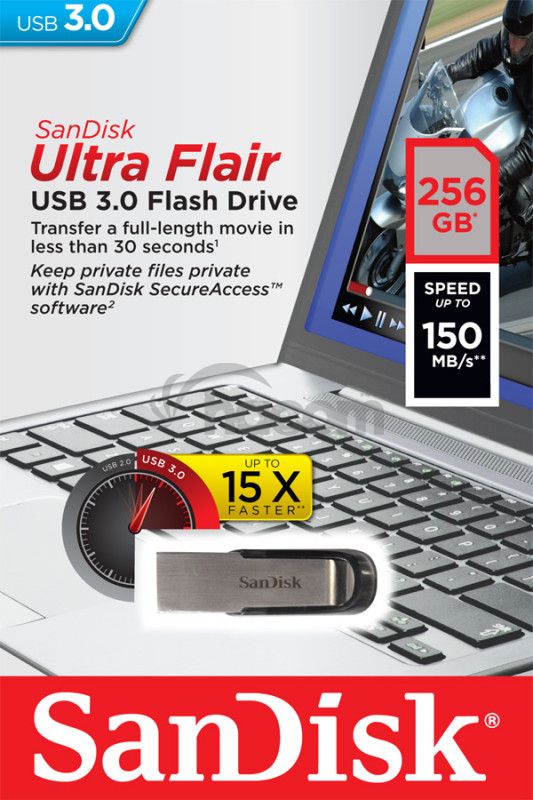 SanDisk Ultra Flair USB™ 3.0 flash disk zaisťuje rýchle presuny Vašich dát medzi jednotlivými médiami, tým skráti Vaše čakanie. Vďaka USB 3.0 prenesie Vaše dáta rýchlejšie ako štandardný USB 2.0. Štýlový elegantný kovový dizajn je navrhnutý tak, aby bol dostatočne pevný a odolával nárazom. Umožňuje nastaviteľnú ochranu heslom, takže si môžete byť istí, že Vaše dáta zostanú súkromné a viditeľné je pre Vami zvolené osoby.Technické detaily: