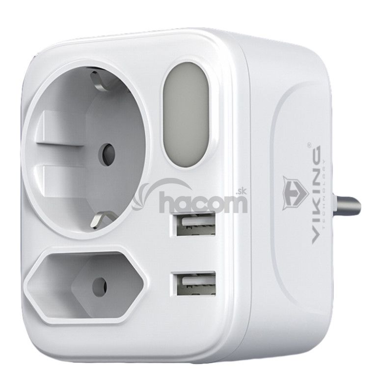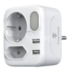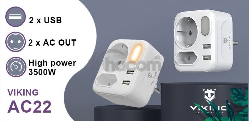 Sieťový adaptér • rozbočovač • zásuvka • 2 x AC (230V) výstup • 2 x USB-A (5V/2.4A) • kompaktný dizajn a rozmery • možnosť nabíjania až 4 zariadení súčasne • LED svietidloSieťový adaptér Viking AC22