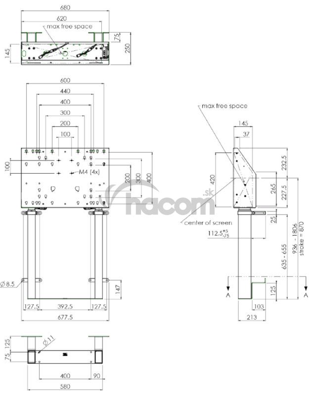 Držiak je osadený uchyteniami VESA až do 600 x 400 mm, pre prípad montáže väčších displejov je pribalený aj adaptér zvyšujúci VESA až na 800 x 600 mm, takže bude vyhovovať aj tým najväčším obrazovkám. V kabinete za displejom je priestor na umiestnenie PC, prehrávača, tenkého klienta a pod. Pre montáž týchto malých zariadení je stojan vybavený aj rozhraním VESA 75/100 a možnosťou uzamknutia s pomocou dokúpiteľného krytu.