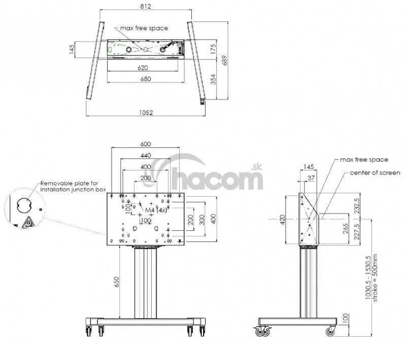 Pojazdný motorizovaný zdvih displejovStojan s elektrickým zdvihom využijete predovšetkým v oblasti vzdelávania, digitálnej tvorby alebo produktového a firemného marketingu. Model 062.7270 ponúka ľahkú zmenu výšky stojana o 500 mm, takže stred obrazovky sa môže pohybovať v rozpätí 1 030 – 1 530 mm.