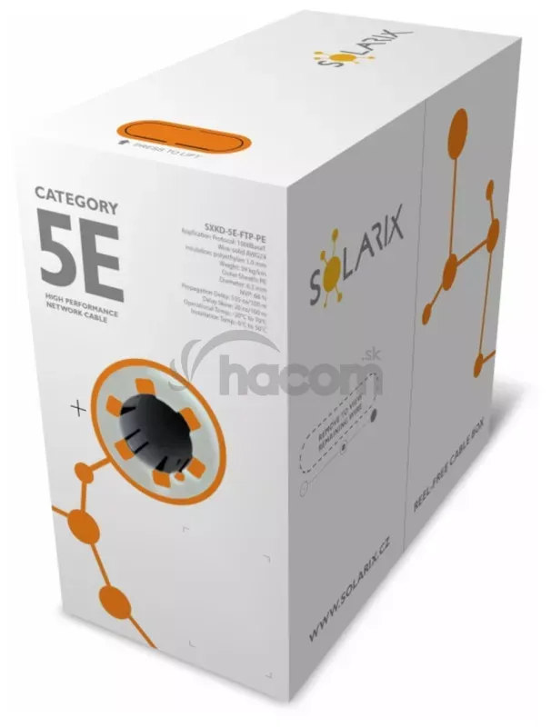 Inštalačný kábel s označením SXKD-5E-FTP-PE je vonkajšia tienený kábel CAT5E s polyetylénovým plášťom. Kábel je určený pre náročnejších inštalácie, kde bežný dátový kábel s PVC alebo LSOH plášťom neposkytuje dostatočnú ochranu proti vplyvom okolitého prostredia. Spoločne s ostatnými komponentmi systému štruktúrovanej kabeláže Solarix vytvára riešenie, ktoré zaručuje dlhú životnosť, maximálny výkon a bezproblémový chod počítačovej siete. Inštalačné káble Solarix - kategórie 5E sú určené pre horizontálne rozvody a sú ponúkané v tienenej aj netienené verzii s rôznym typom plášťa - tj. PVC, LSOH alebo UV stabilný PE. Tieto káble bez problémov spĺňajú požiadavky definované v medzinárodných štandardoch ANSI / TIA / EIA 568, ISO / IEC 11801 a EN 50173 pre kategóriu 5E a sú vhodné aj pre prenos dát rýchlosťou až 1 Gb / s (tj. Gigabitový Ethernet).