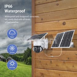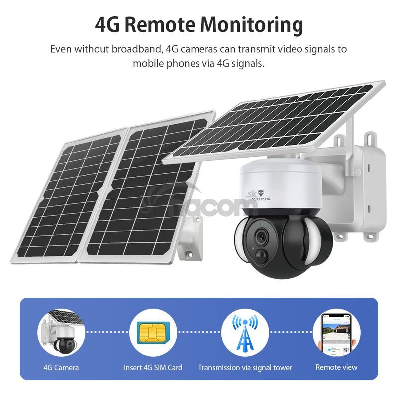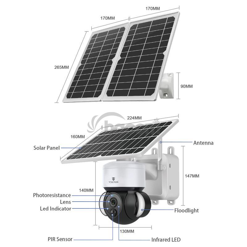 Solárna HD kamera VIKING HDs02 4G s otočným motorizovaným objektívom, ochranou IP66 (platí iba v prípade, že sú všetky vstupné aj výstupné konektory zakryté napr. silikónovým ochranným krytom) a silným nočným infračerveným videním. Vhodná na zabezpečenie priestorov bez možnosti napájania. Vďaka trom solárnym panelom je kamera úplne nezávislá na elektrickej sieti.