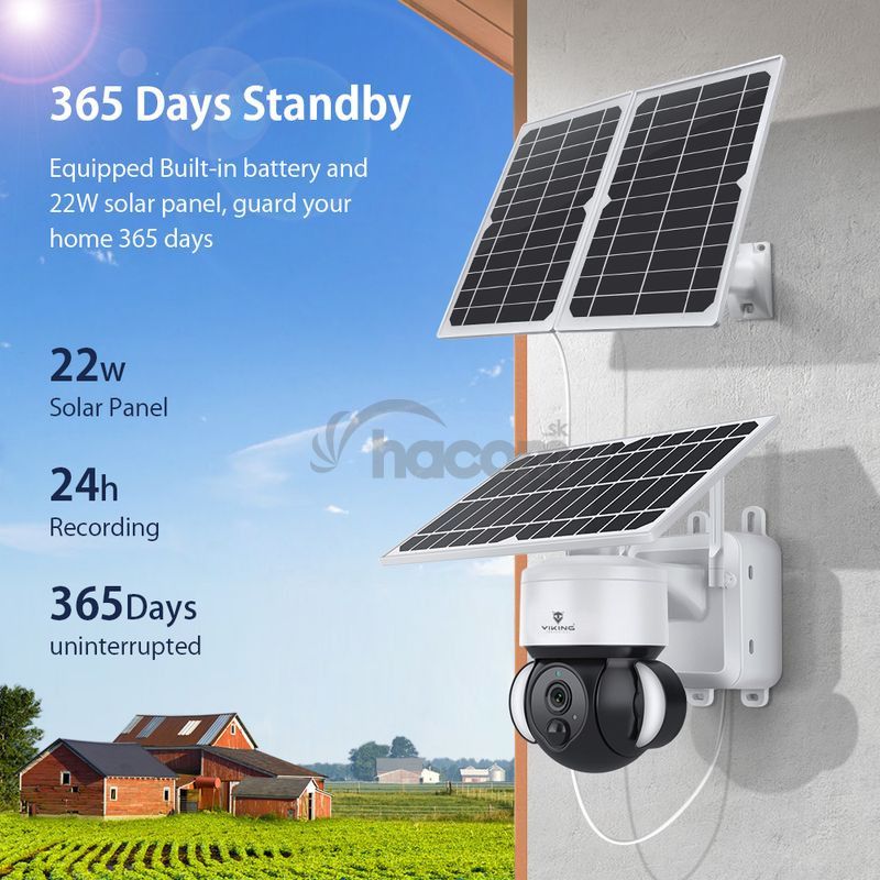 Solárna HD kamera Viking HDs02 4G je možné napájať buď tromi solárnymi panelmi, ktoré dodajú Vašej kamere dostatočný výkon pre prevádzku, alebo cez USB-C priamo z elektrickej siete. Celkový výkon solárnych panelov je 22W (2x8W a 1x6W). Vďaka svojej integrovanej batérii (30 000mAh) vydrží bez problému robiť záznam aj v čase, keď práve nie je vydarený slnečný deň. Táto kamera vďaka svojej funkcii automatického uspania výrazne šetrí spotrebu energie. Kamera sa automaticky aktivuje v prípade, keď zaznamená pohyb.