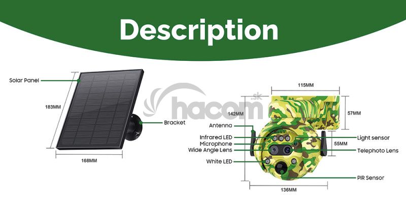 •Rozmery: Kamera 14,2 x 13,6 x 14,5 cm, Solárny panel 18,3 x 16,8 cm