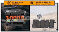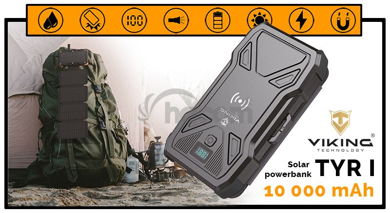 Solárna powerbanka • Kapacita 10000mAh (37Wh) • podpora rýchlonabíjania QC3.0 a Power Delivery • USB-C vstup až PD18W • USB-C výstup (PD20W max.) • 2 x USB-A výstup (QC22.5W max.) bezdrôtové wireless nabíjanie 15W max. • 5 solárnych panelov 8W max • IP54 • LED svietidloSolárna powerbanka VIKING TYR I