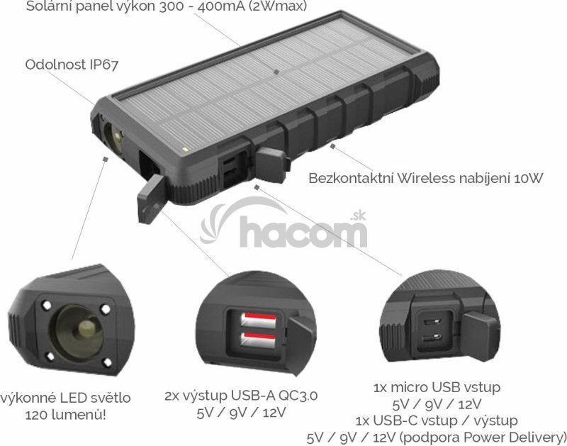 Pre nabíjanie powerbanky môžete využiť 3 spôsoby dobíjania: 1) konektor USB-C 2) micro USB 3) solárny panel. Poprípade variantu solárneho nabíjania + nabíjanie z konektora USB-C, alebo micro USB.