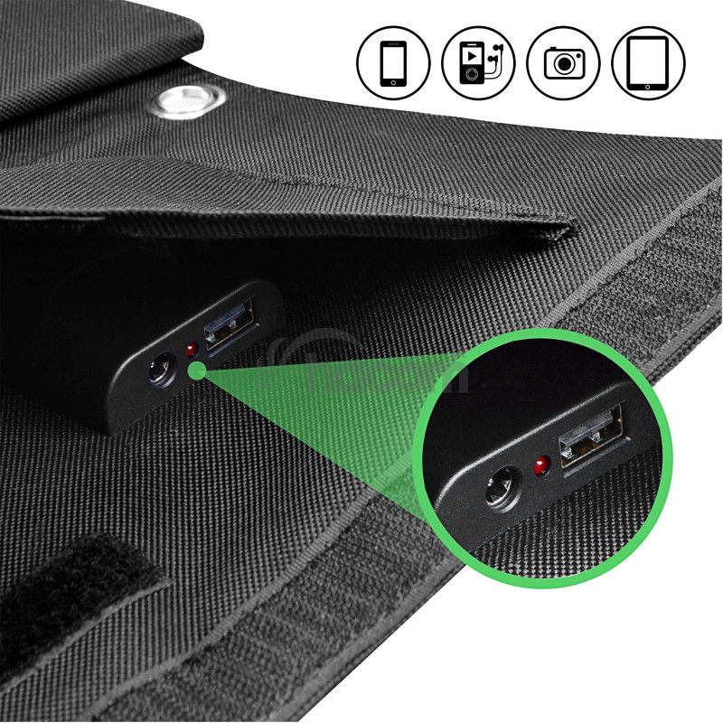 4. Vďaka okám po stranách, vode odolného polyesterového plátna, je solárna nabíjačka ľahko prichytiteľná k čomukoľvek, pre pohodlné nabíjanie (k batohu, k taške, ku kolesu, na stan, atď.)
