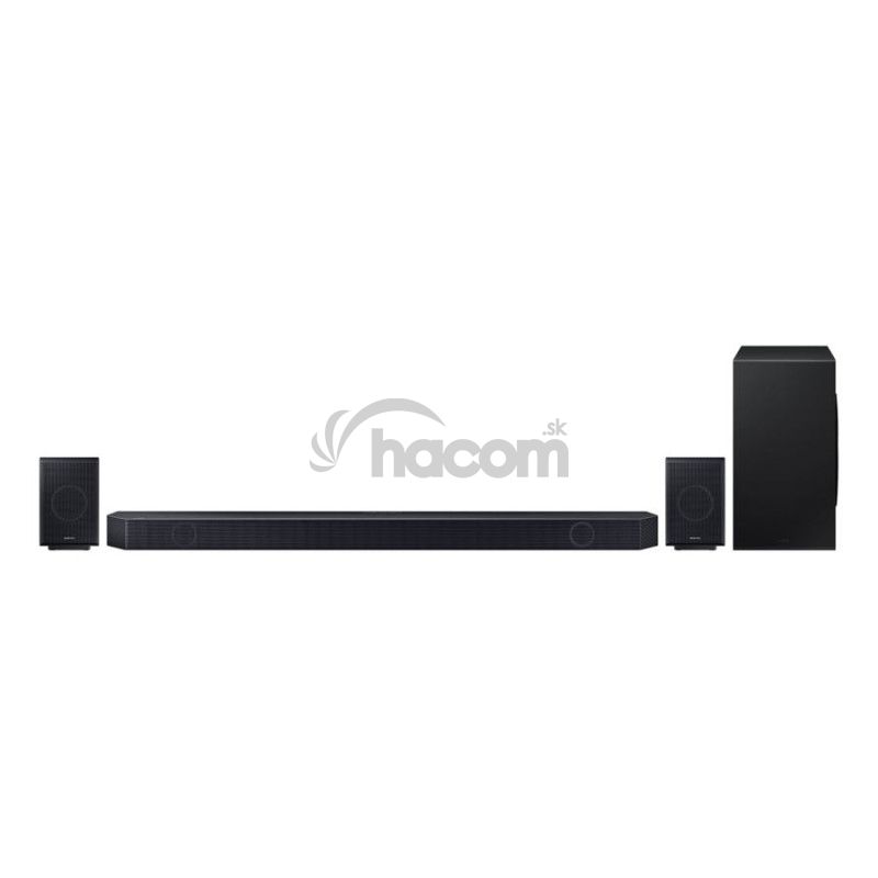 Samsung luxusný soundbar s Dolby Atmos, 656 W, počet kanálov 11.1.4, 22 reproduktorov, 8" Aktívny Bezdrôtový subwoofer, Wide Range Tweeter, Stredový reproduktor, Up -firing reproduktory - vyžarujúce zvuk hore, Side-firing reproduktory - vyžarujúce zvuk do strán, Front Wide-firing reproduktory, Samostatné bezdrôtové zadné reproduktory - súčasť balenia, Bezdrôtový Dolby ATMOS, SpaceFit Sound Pro, Auto EQ, Active Voice Amplifier (zvyšovanie hlasitosti dialógov v rušnom prostredí), Q Symphony 3.0, Dolby Atmos / Dolby MAT / Dolby Digital Plus / Dolby True HD, DTS-HD HRA, DTS-HD MA, DTS Express, DTS 5.1ch, DTS:X, 4K Video Pass, HDR, HDR 10+, Wi-Fi, Tap sound, Bluetooth 4.2, 1x HDMI vstup, 1x HDMI výstup, eARC, HDMI CEC, optický audio vstup, podporované formáty: AAC, MP3, WAV, WMA, OGG, FLAC, ALAC, AIFF, ovládanie TV a SB jedným ovládačom, Sound Módy: SSE, Standard, Adaptive 2.0, Game Pro 2.0, Voice enhance mode, Night mode, Aktívne potláčanie okolitého hluku, Smart Things app. podpora, Chromecast, Airplay, Podpora hlasového asistenta (Alexa, Google), držiak na stenu v balení, čierne prevedenie