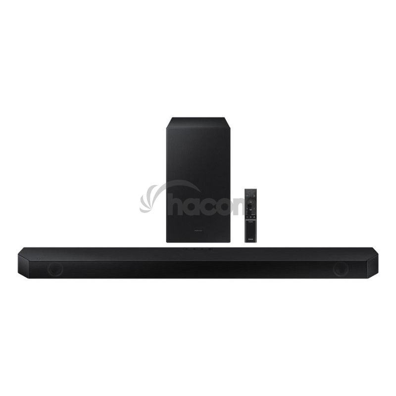 Samsung Soundbar, 340 W, počet kanálov 3.1, 7 reproduktorov, 6.5" Aktívny Bezdrôtový Subwoofer, Stredový reproduktor, Q Symphony, Dolby Atmos / Dolby MAT / Dolby Digital Plus / Dolby True HD, DTS 5.1, Tap Sound, Bluetooth 4.2, Bluetooth Power On, USB 2.0, optický audio vstup, 1x HDMI vstup, 1x HDMI výstup, HDMI eARC, HDMI CEC, 4K Video Pass, HDR, HDR 10+, podporované formáty: AAC, MP3, WAV, WMA, OGG, FLAC, AIFF, Sound Módy: SSE, Game, Standard, DTS Virtual:X mód, Adaptive Lite, Voice enhance mode, Night mode, ovládanie TV a SB jedným ovládačom, držiak na stenu v balení, čierne prevedenie