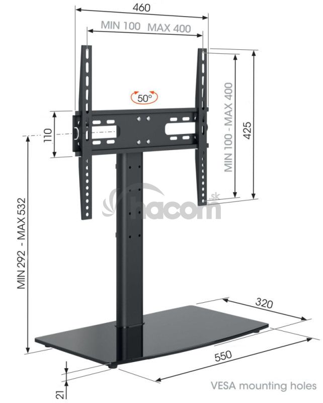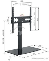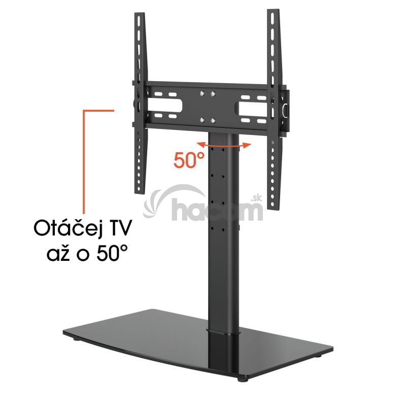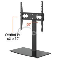 Vďaka základovej doske s rozmermi 55 x 32 cm nepotrebujete tak širokú televíznu skrinku ako u bežných televíznych podstavcov. Základná doska je vyrobená z tvrdeného skla a zaisťuje mimoriadnu stabilitu televízora. Pri inštalácii si sami zvolíte výšku, v ktorej chcete televízor namontovať. Televízor môžete ľahko natočiť až o 50 ° smerom na svoje obľúbené kreslo.