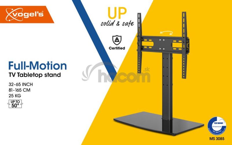Pre televízory s uhlopriečkou od 32 do 65 palcov (165 cm)Montáž televízora na požadované miesto bez vŕtania? Aj to je možné! MS 3085 je robustný stolný stojan na televízor, ktorý je možné umiestniť na skrinku alebo iný nábytok. Televízor s uhlopriečkou od 32 do 65 palcov a hmotnosťou až 25 kg postavíte behom chvíľky.