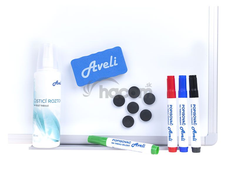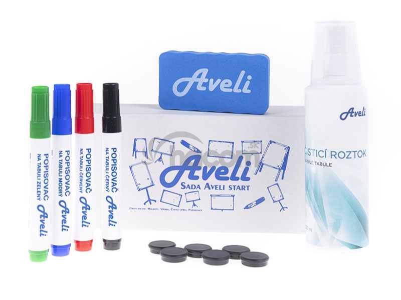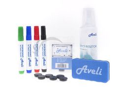 Základná sada pomôcok k popisovacím tabuliam. Sada obsahuje: 4 farebné popisovače na biele tabule, čistiaci 250 ml sprej, 6 čiernych okrúhlych magnetov s priemerom 24mm, 1 magnetická stierka- 4 popisovače (čierny, červený, modrý, zelený)