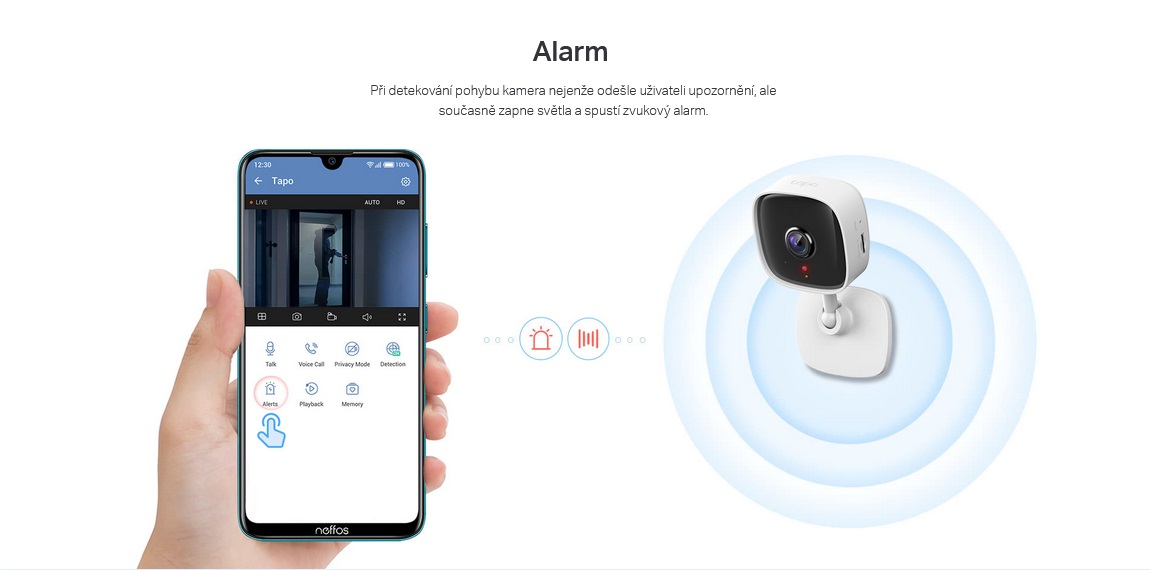 - Zvukový a svetelný alarm: spustite svetelné a zvukové efekty, ktoré vystraší nechcené návštevníkov