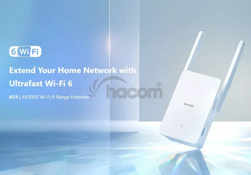 - Tenda A33 - WiFi Range Extender AX3000 WiFi 6, opakovač 2976 Mb/s, 1x GLAN 1 Gb/s, WPS, 2x 5dBi, WPA3 A33