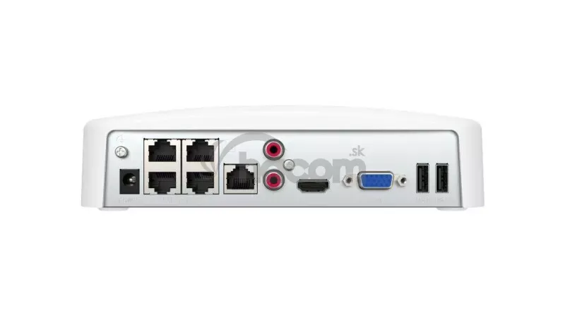 Porty: 4x LAN PoE RJ45 port 10/100 Mb/s na pripojenie kamier, 1x LAN RJ45 port 10/100 Mb/s na pripojenie na Internet, 2x RCA zvuk, 1x HDMI, 1x VGA, 2x USB 2.0, 1x Napájací Jack