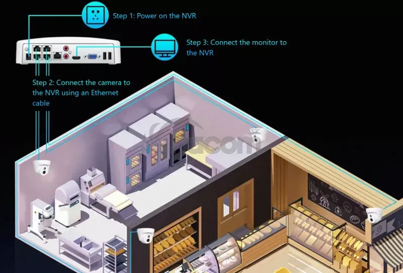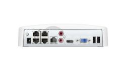 Porty: 4x LAN PoE RJ45 port 10/100 Mb/s na pripojenie kamier, 1x LAN RJ45 port 10/100 Mb/s na pripojenie na Internet, 2x RCA zvuk, 1x HDMI, 1x VGA, 2x USB 2.0, 1x Napájací Jack