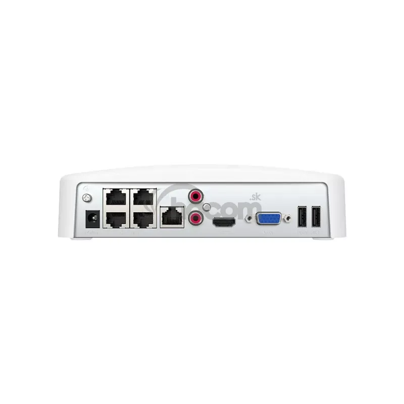 Porty: 4x LAN PoE RJ45 port 10/100 Mb/s na pripojenie kamier, 1x LAN RJ45 port 10/100 Mb/s na pripojenie na Internet, 2x RCA zvuk, 1x HDMI, 1x VGA, 2x USB 2.0, 1x Napájací Jack