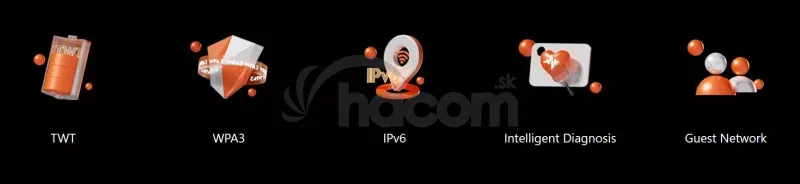 QoS a pokrytie: SMART QoS, 802.11e WMM, MU-MIMO, OFDMA, 1024-QAM, Beamforming, AP Steering, Band Steering