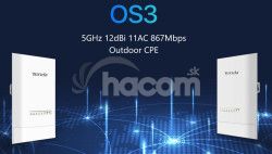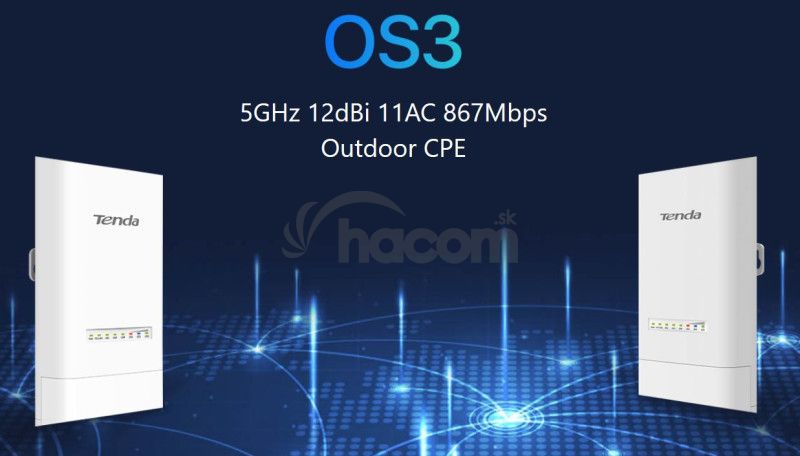 Tenda OS3 je bezdrôtová vonkajšia Wi-Fi CPE jednotka s podporou mnohých režimov AP/Station/WISP/P2MP/WDS Repeater/Router, podporuje štandard 802.11a/n/ac v pásme 5 GHz s rýchlosťou až 867 Mb/s. Obsahuje 4x LAN port 10/100 Mbps, podporuje pasívne PoE napájanie alebo napájací adaptér (napájacia výhybka aj adaptér sú súčasťou balenia). VPN Pass-Through, SSID Isolation, DDNS, DHCP, Transparent Bridge, VLAN tagging SSID, a ďalšie technológie.