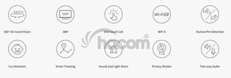 Vnútorná IP kamera s AI detekciou pohybu, WiFi 6, a 2K rozlíšením 2304 x 1296 (3MP), zabezpečenie WPA3-SAE, prenosom zvuku, rotácia 360 ° horizontálne a 155 ° vertikálne, nočné videnie s dosvitom 12 m, sledovanie S-Motion + S-tracking, vstavaný mikrofón, vstavaný reproduktor a siréna, cloud platforma, slot pre SD kartu max. 256 GB, detekcia plaču, volanie pomocou jedného tlačidla, aplikácia pre Android a iOS v slovenčine.Popis produktu