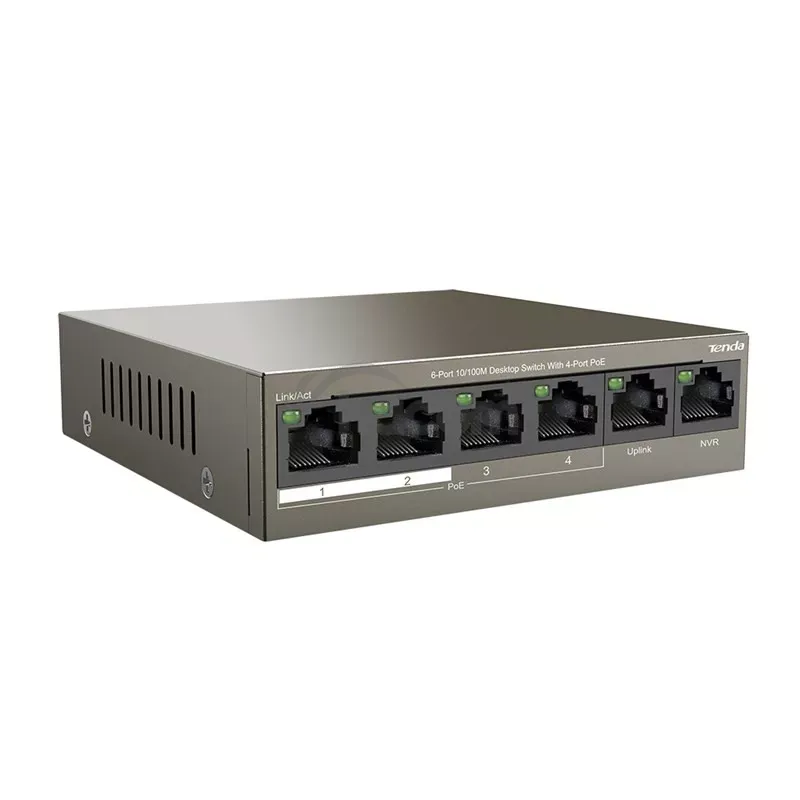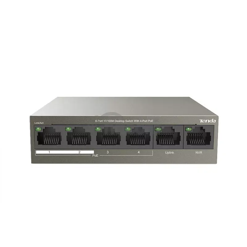 Tenda TEF1006P-4-63W prepína dáta pomocou 6ti portov RJ45 s prenosovou rýchlosťou 10/100 Mb / ss automatickou detekciou rýchlosti. Dva porty slúži ako Uplink a 4 PoE porty podporujú PoE 802.3af a 802.3at. Switch podporuje stabilnú 8 jadrové PoE napájania, ochrana proti prepätiu 6kV. Podpora prepojovanie uzlov v móde Store-and-Forward. Full-duplex kontrola toku 802.3x, half-duplex kontrola toku v režime Back-Pressure. Dva Uplink porty je možné využiť na pripojenie switcha do siete a druhý na pripojenie ďalšieho zariadenia bez PoE, napr. NVR a ďalšie.