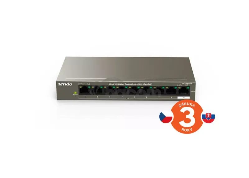 - Tenda TEF1109P-8-63W PoE AT switch 8x PoE 802.3af/at, 9x 100Mb/s, PoE celkem 63W, fanless