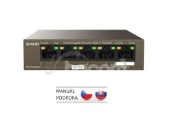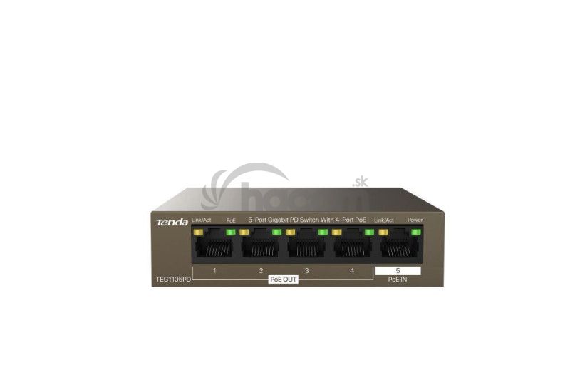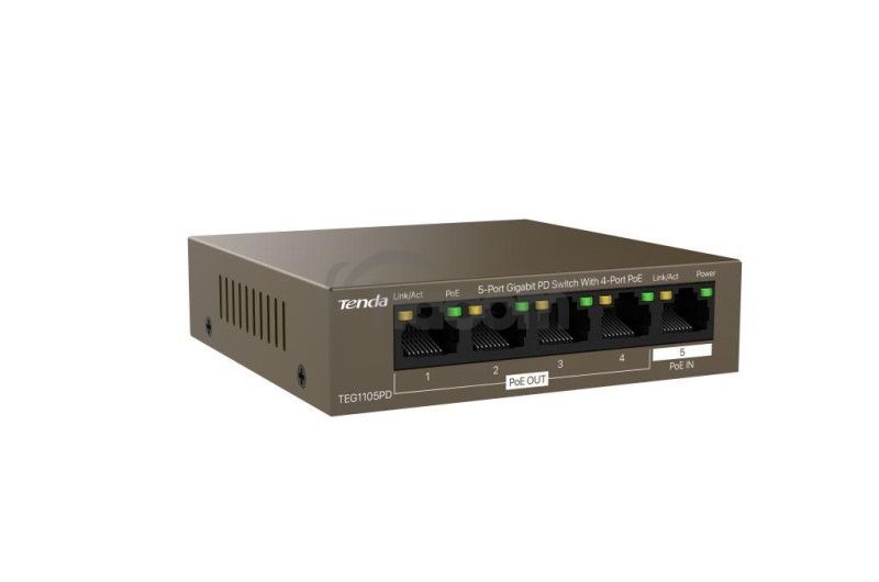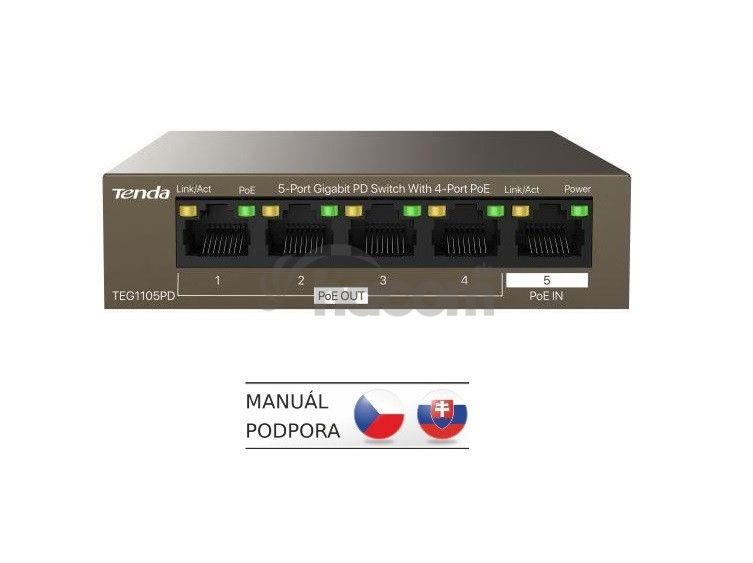 - Tenda TEG1105PD PoE PD Gigabit switch, 1x PoE IN, 4x PoE OUT 802.3af, 5x 1 Gb / s, max. 30W, fanless TEG1105PD