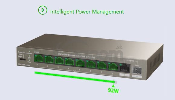 Napájanie portov pomocou PoE 802.3af (15,4W) a 802.3at (30W). Max. celkom 92 Wattov na 8 PoE portov, využitie pre vonkajšie aj vnútorné IP kamery, Access Pointy/Routery, IP telefóny, apod.