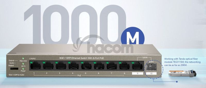 - Tenda TEG1110PF-8-102W PoE AT switch 8xPoE 802.3af/at + Uplink RJ45 + SFP port, 92W, PoE+, fanless TEG1110PF-8-102W