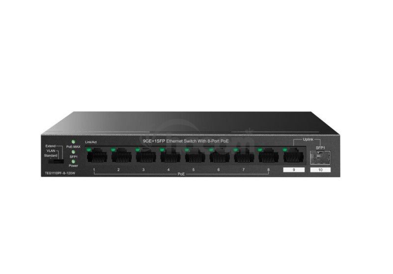 - Tenda TEG1110PF-8-120W PoE AT switch 8xPoE 802.3af/at + Uplink RJ45 + SFP port, 110W, PoE+, fanless 75012025