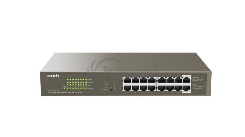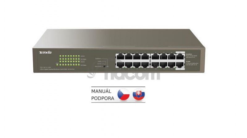- Tenda TEG1116P-16-150W PoE AT Gigabit switch 16x 1Gb / ss PoE 802.3af / at, PoE 135W, Rackmount, Fanless TEG1116P-16-150W