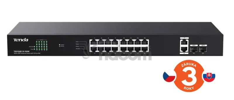 - Tenda TEG1120P-16-150W PoE+ Gigabit switch 16x 1Gb/s PoE+ 802.3af/at + 2x SFP + 2x RJ45, 135W, Rack 75011997