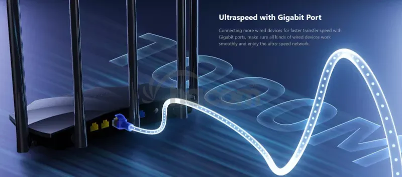 - Stabilné pripojenie a pokrytie - vďaka podpore MU-MIMO a OFDMA je možné pripojiť viac zariadení pri zachovaní plnej stability signálu, navyše technológia Beamforming a päť 6 dBi antén zaisťujú rozsiahle pokrytie