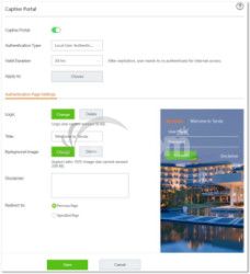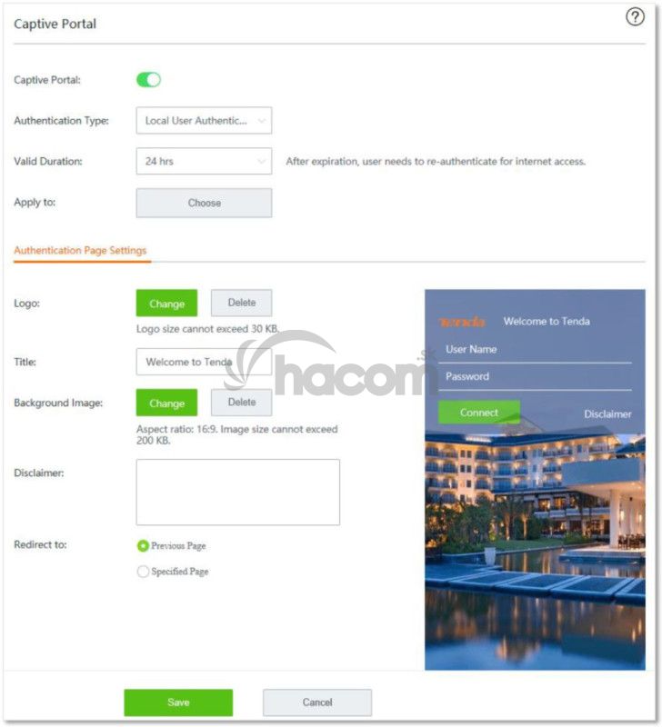 Router podporuje základní nebo vlastní Captive portal. Velkou výhodou je že užvatel nemusí nic "programovat". Nastavení je jednoduché a hotové během několika minut. Kromě základního nastavení s logem Tenda a defaultním pozadí je možné nastavit: autentifikace (Kliknutím na potvrzovací tlačítko / Jméno + heslo / Email / Facebook). Dále se nastavuje čas jak dlouho má být uživatel přihlášen, pro kabelové i WiFi připojení zvlášť. Logo - nahrání vlastního loga do 30kB. Titulek - vlastní uvítací text. Obrázek na pozadí - vlastní obrázek 16:9 do 200kB. A navíc je možné nastavit webovou stránku která se má zobrazit po přihlášení.