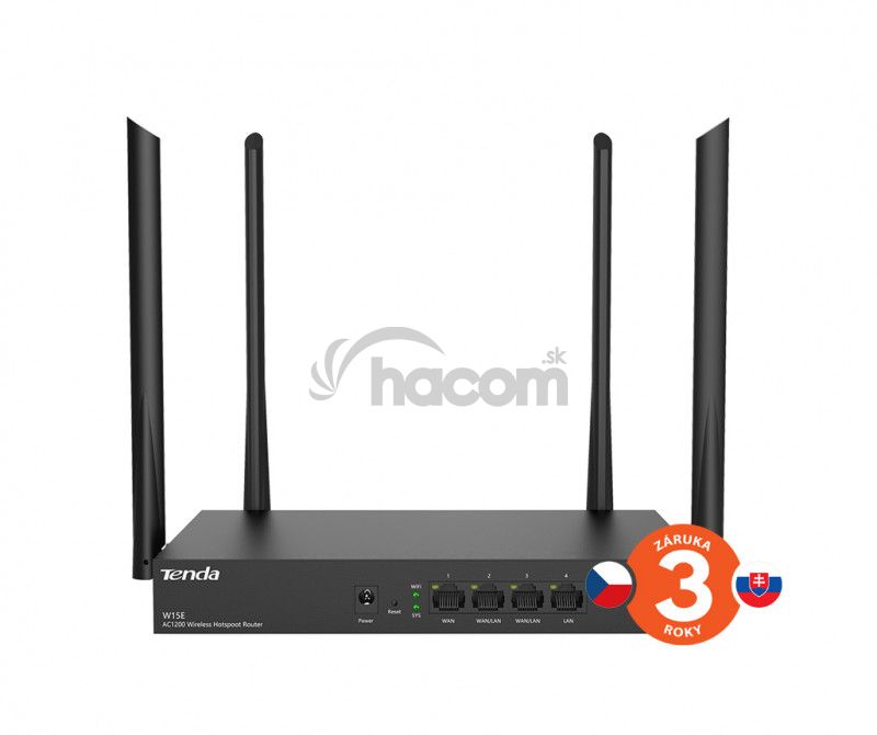 AC1200 Dual-Band Wi-Fi Hotspot router 802.11 ac/a/b/g/n, až 1167 Mb/s, 1x WAN, 2x WAN/LAN, 1x LAN, 4x anténa 6 dBi. (2,4GHz 300Mbps + 5GHz 867Mbps), Captive portal, IPv6, VPN Server / Client, Multi WAN balance, kontrolér pro AP Tenda, DDos + ARP attack protection, DDNS.Součástí balení je český, slovenský, a polský manuál.