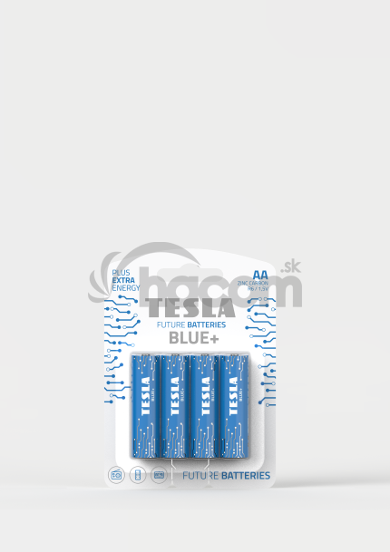 BLUE - TESLA BLUE + Jedná sa o rad zinko-uhlíkových batérií so základným výkonom. Hlavným benefitom tohto radu je cenová dostupnosť. Tieto batérie sú vhodné predovšetkým do menej energeticky náročných zariadení s krátkodobým odberom nízkeho množstva prúdu. 4 ks batérií v balení