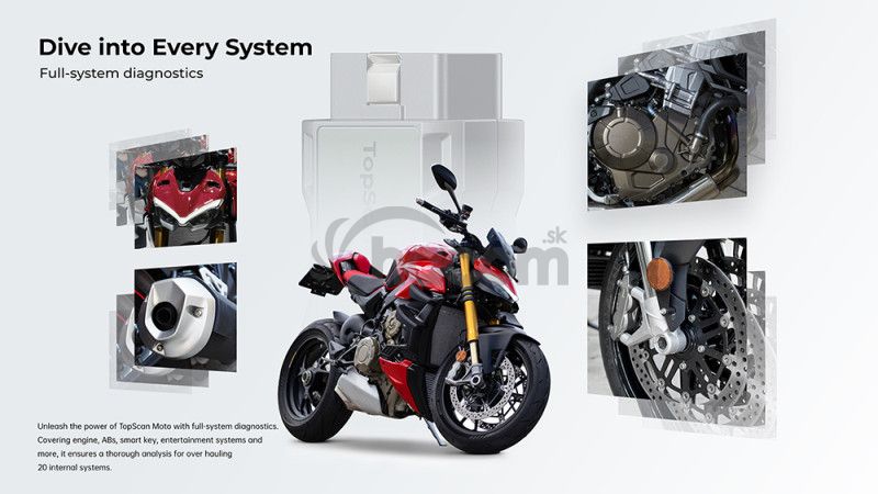 Uvoľnite silu systému TopScan Moto s diagnostikou celého systému. Zahŕňa motor, ABS, inteligentný kľúč, zábavné systémy a ďalšie a zaisťuje dôkladnú analýzu pre generálnu opravu 20 vnútorných systémov. Komplexný prístup zaisťuje presné riešenie problémov.