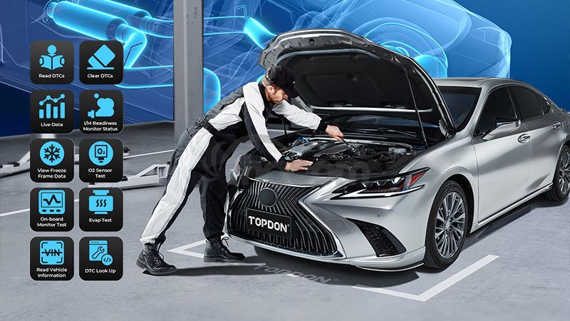 Prístroj TopScan Pro od spoločnosti TOPDON funguje ako čítačka kódov OBD2 a vykonáva všetkých 10 režimov testovania OBD2 zadarmo po celú dobu životnosti, čo vám umožní prístup k dôležitým informáciám o ešte viacerých vozidlách. Podporuje tiež všetky funkcie, vrátane čítania DTC, vymazania DTC, živých dát, stavu monitora pripravenosti I/M, zobrazenia dát Freeze Frame, testovania snímača O2, testovania palubného monitora, testovania výparov, čítania informácií o vozidle a vyhľadávania DTC.