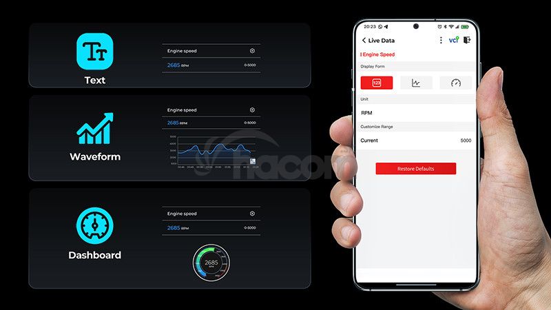Zobrazenie dátových tokov vo forme textu, grafu alebo grafu podobného prístrojovému panelu. To pomáha používateľom intuitívne sledovať zmeny dát v čase. Použitie funkcie "Kombinovať" pre grafické zobrazenie až 4 dátových tokov v jednom rozhraní umožňuje používateľom vyhodnocovať výkonnosť pomocou porovnávacích dát a robiť presné a efektívne rozhodnutia.