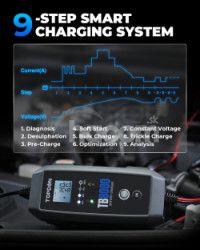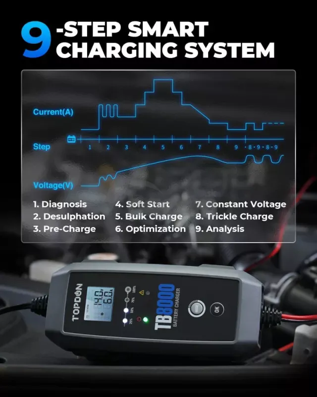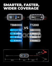 9-stupňový systém inteligentného nabíjania TB8000 poskytuje používateľom špičkovú technológiu, ktorá automaticky identifikuje stav batérie a dodáva najvhodnejší prúd. S týmto zariadením sa už nemusíte obávať poškodenia batérií!