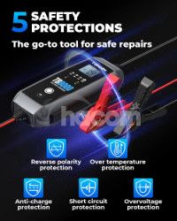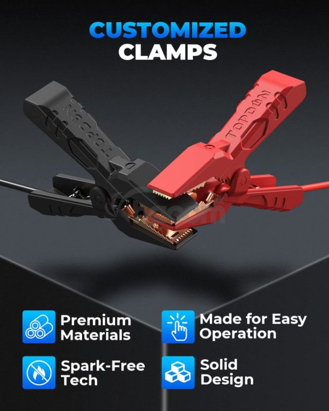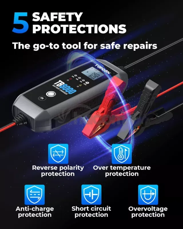 TOPDON TB 8000 ponúka vynikajúce bezpečnostné funkcie vďaka 5-tim vstavaným systémom ochrany proti prepólovaniu, spätnému nabíjaniu, skratu, prehriatiu a prepätiu. Navyše je táto nabíjačka batérií vybavená inovatívnou technológiou pre elimináciu iskier.