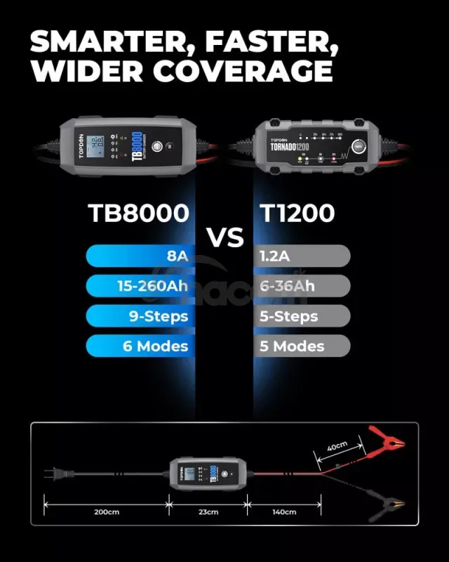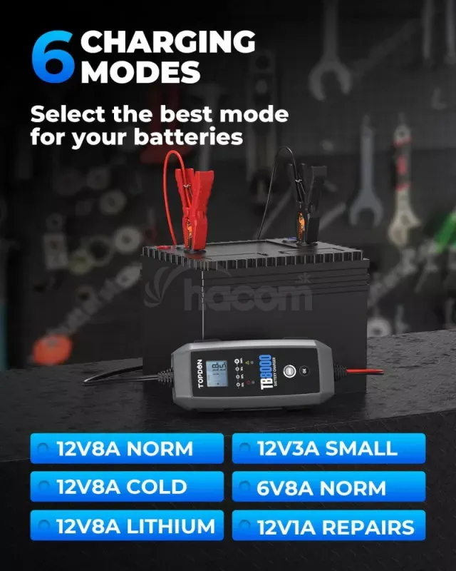 Nabíjačka batérií TOPDON TB8000Nabíjačka batérií TOPDON TB8000 ponúka dva nabíjacie prúdy 8A a 3A pre batérie od 15Ah do 260Ah. S týmto Jedinečným nástrojom budete môcť nabíjať batérie v automobiloch, motocykloch, jachtách, nákladných automobiloch, SUV, MPV, traktoroch a mnohých ďalších. Vďaka 6-tich nabíjacím režimom, 12V/8A Norm, 12V/8A Cold, 12V/8A Lítium, 12V/3A Small Norm, 6V/8A Norm a 12V Repair, si vyberiete ten, ktorý bude najviac vyhovovať Vašim potrebám!