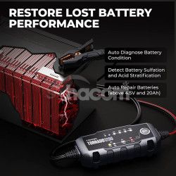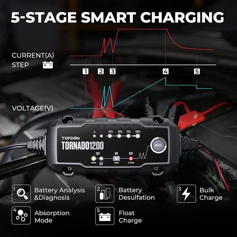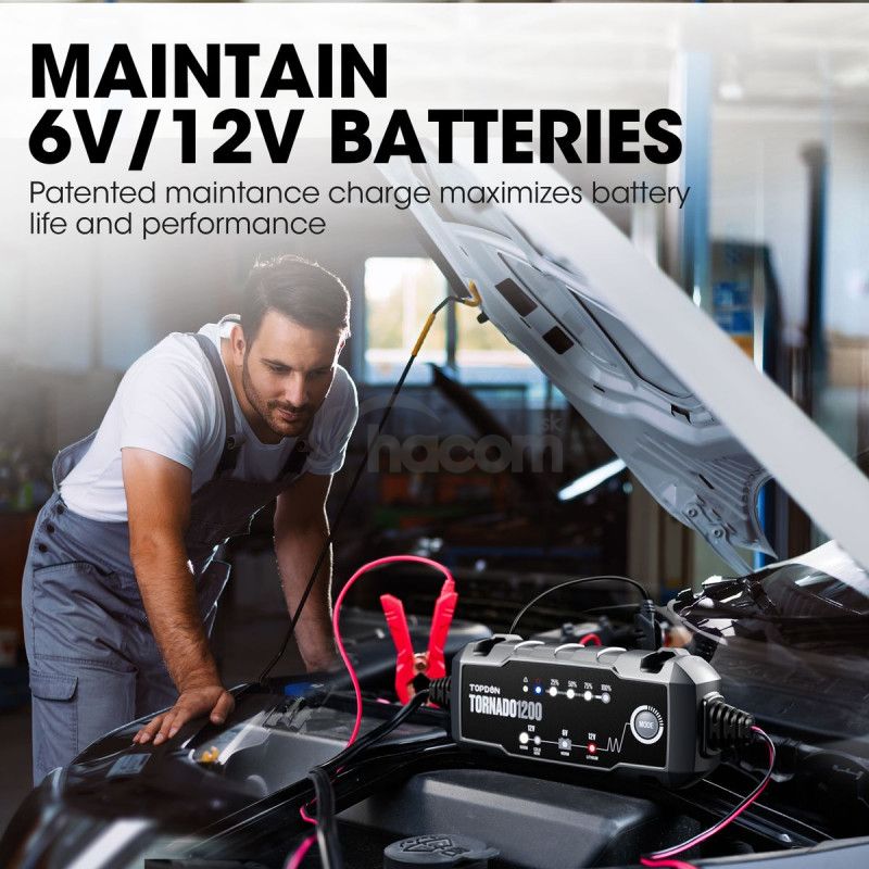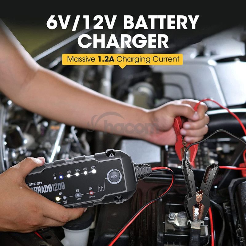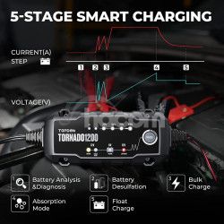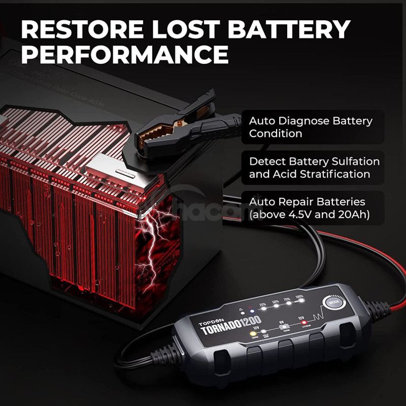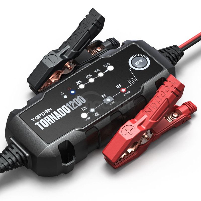 Tornado 1200 dokáže nabíjať 6V vybité batérie s napätím vyšším ako 4,5V a nabíjať 12V vybité batérie s napätím vyšším ako 8,5V, čím privedie vaša batéria späť k životu! Vstavaný mikroprocesor riadi proces nabíjania pre lepšiu opravu batérie.