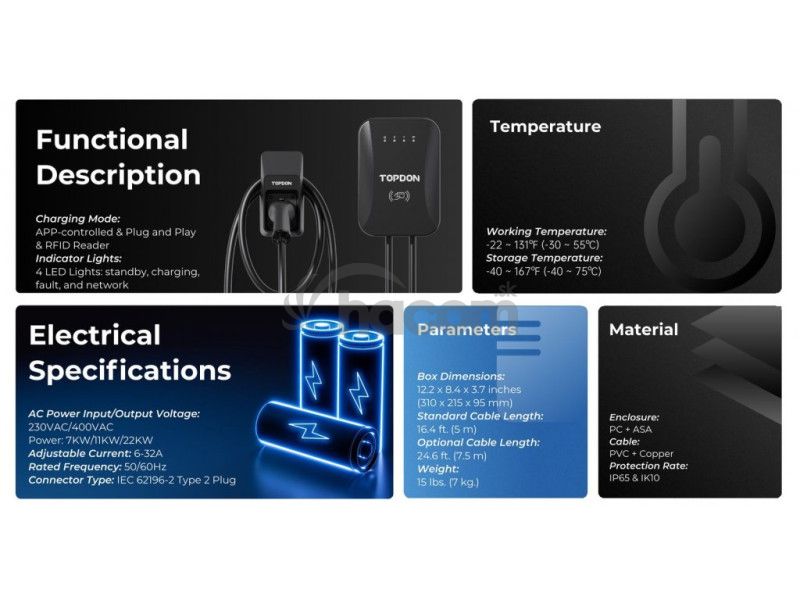 Nabíjacia stanica pre elektromobily PulseQ AC Home od firmy TOPDON ponúka užívateľom všestrannosť, prispôsobivosť a múdru technológiu, čím robí nabíjanie elektromobilov široko dostupným. Vďaka IEC62196-2 Type 2 konektoru je PulseQ AC Home kompatibilný s väčšinou európskych AC elektrických vozidiel.
