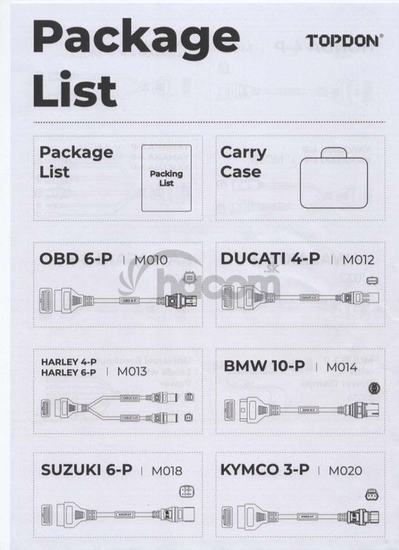 Topscan Moto Master Káblová Sada slúži na prepojenie motocykla s diagnostickým zariadením TopScan Moto. Tento adaptér umožňuje správne pripojenie motocyklov konkrétnej značky k zariadeniu, čo umožňuje čítanie diagnostických dát a vykonávanie servisných kontrol. Použitie káblovej sady je nevyhnutné pre motocykle, ktoré nie sú vybavené štandardným OBD-II portom.