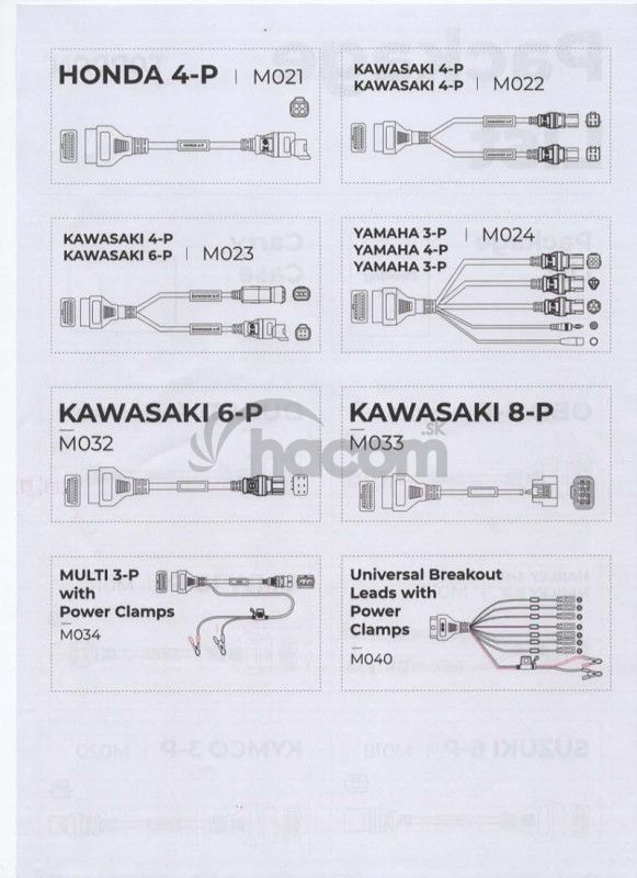 Káblová sada je navrhnutá pre spoľahlivý prenos dát medzi motocyklom a diagnostickým zariadením, čo vám uľahčí vykonávanie diagnostiky, zistenie závad a optimalizáciu výkonu. Táto sada obsahuje značky BMW, Harley, Ducati, Kawasaki, Honda, Yamaha, Suzuki.