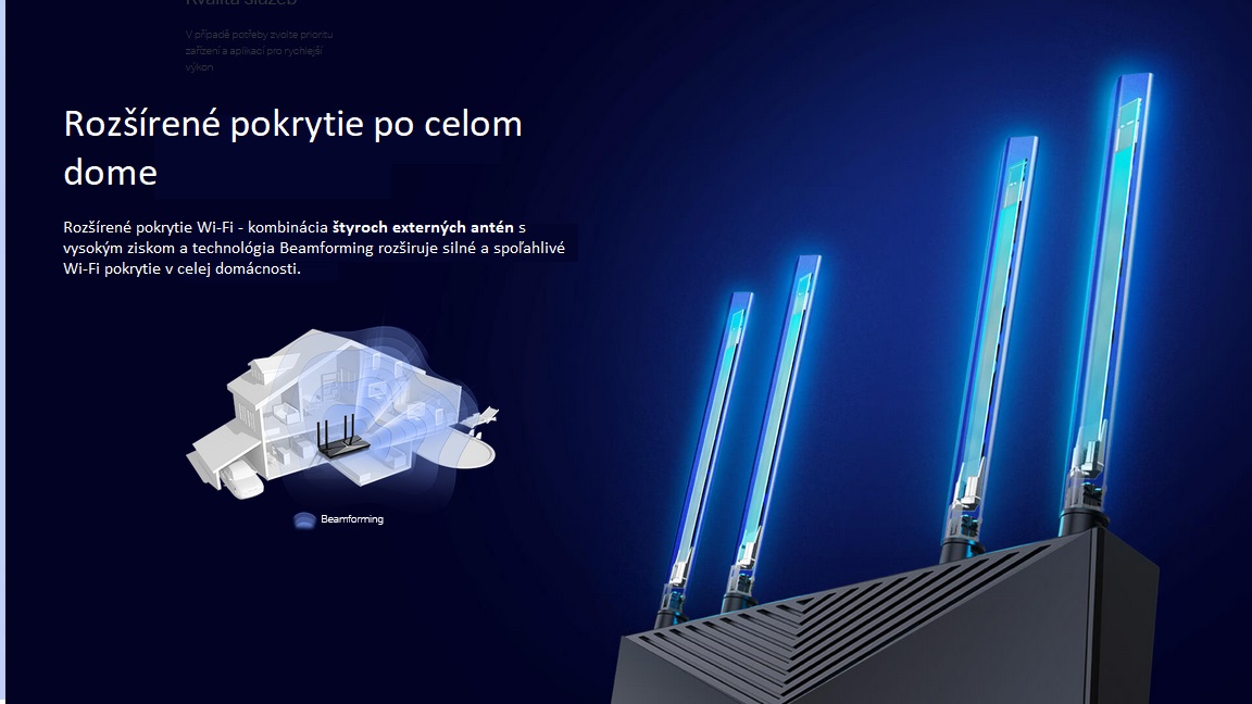 Rozšírené pokrytie Wi-Fi - kombinácia štyroch externých antén s vysokým ziskom a technológie Beamforming rozširuje silné a spoľahlivé Wi-Fi pokrytie v celej domácnosti.