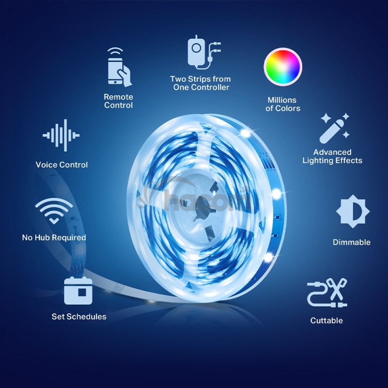 Smart Light Strip, MulticolorSPEC: 2.4 GHz Wi-Fi, 802.11b/g/n, dva 16.4 ft/5m RGB LED light strips, 12V/1.5A power adapter